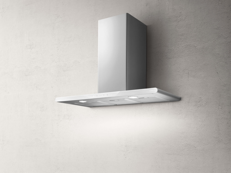 Комфорт и безопасность: Островная вытяжка ELICA GALAXY ISLAND WHIX/A/90X45 с потолочным монтажом выполнена в цвете «нержавеющая сталь» и дополнена панелью из белого стекла.