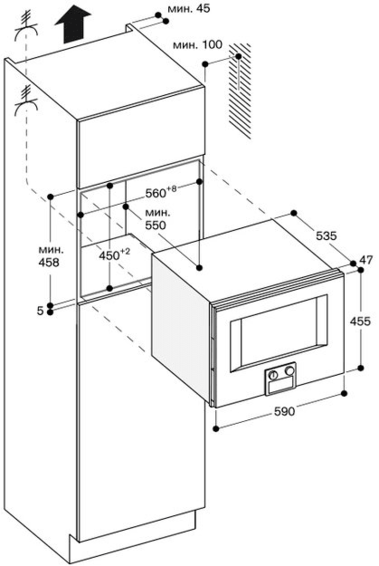 Комбинированный духовой шкаф – микроволновка BM450100 c панелью управления сверху. Навеска двери справа – артикул BM450100 или слева – артикул BM 451100, не перенавешивается. • Сенсорное открытие дверцы • Возможность раздельного или комбинированного использования микроволн, гриля и режима духового шкафа • Последовательная работа до 5 режимов, а также программирование комбинированных режимов и оставшегося времени. • Сенсорный TFT – дисплей • Панель управления интегрирована в дверцу • Электронный контроль температуры • Полезный объем духовки 36 литров • Микроволны с регулировкой 5 уровней мощности: 1000, 600, 360, 180, 90 • Духовой шкаф с регулировкой 4 режимов нагрева: Горячий воздух 40 °C и в диапазоне от 100 °C до 250 °C, Гриль большой площади в комбинации с горячим воздухом с температурой от 100 °C до 250 °C, Гриль большой площади в комбинации с конвекцией и температурой от 100 °C до 250 °C, Гриль с регулировкой 3 уровней интенсивности и максимальной мощностью в 2000 Вт. • Каждый из вариантов нагрева можно сочетать с микроволнами различного уровня мощности 600, 360, 180 и 90 Вт • 15 автоматических программ с возможностью приготовления на основе веса продуктов: 4 программы размораживания 4 программы приготовления 7 комбинированных программ • Возможность сохранения рецептов пользователя. • Управление с помощью поворотных переключателей и сенсорного TFT – дисплея. • Кнопка для вызова информации с указаниями по обслуживанию. • Дверь открывается в сторону, угол открытия до 180° • Технология Innowave • Быстрый разогрев • 4 уровня для противней. • Индикатор фактической температуры • Галогенное освещение 60 Вт сбоку