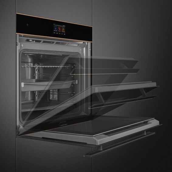 Многофункциональный духовой шкаф с пиролизом, 60 см, 10 функций, чёрное стекло Eclipse, медный профиль. Класс энергопотребления А+