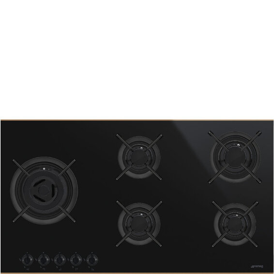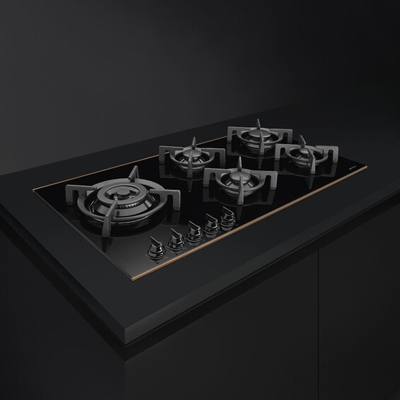 Газовая варочная панель, 90 cм, черная стеклокерамика, профиль медный