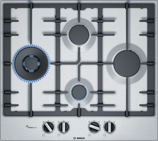 Готовить на газу – это всестороннее удовольствие. Но когда приходится регулировать огонь, начинаются сомнения: где же именно находится положение среднего огня у конфорки? Наши новые газовые плиты с функцией FlameSelect позволят забыть о сложностях регулировки и выбрать один из девяти запрограммированных уровней мощности, установив необходимую степень нагрева. Уровень 1 соответствует бережному тушению, а уровень 9 – кипячению. Идеальный результат одним движением руки.Решетка-подставка для посуды у газовых панелей Bosch состоит из двух или четырех частей. Это облегчает чистку варочной панели. Стальные решетки можно мыть в посудомоечной машине. Решетки из высокопрочного чугуна не только придают варочной панели стильный облик, но и повышают устойчивость посуды. В моделях серии «Газ на стеклокерамике» чугунные решетки пригодны для мытья в посудомоечной машине.