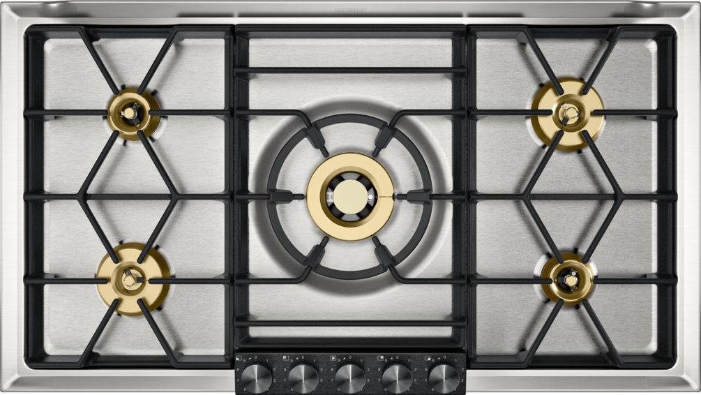 Газовая варочная панель серии Vario — классика бренда. Эта стильная панель шириной 90 см оборудована стандартными горелками и горелками повышенной мощности.