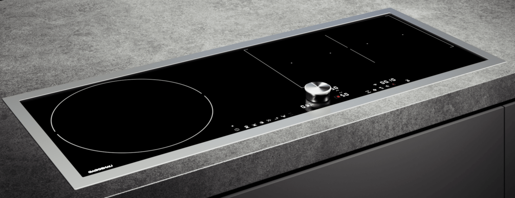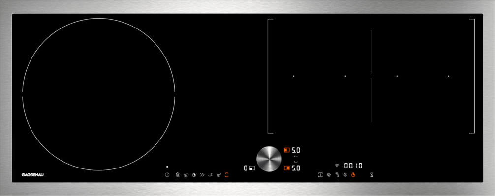 Gaggenau CI290111 — индукционная варочная поверхность, оснащенная тремя зонами нагрева. Имеет панель управления Twist-Pad со съемным магнитным переключателем. Мощность регулируется, предусмотрено 17 ступеней. Безопасность эксплуатации обеспечивают индикаторы включения и остаточного тепла, опция защиты от детей и защитного отключения на время отпуска. Модель представлена с рамкой из нержавеющей стали. • Возможность объединения прямоугольных конфорок в зону flex. • Свободное размещение посуды внутри зоны flex. • Функция разделения варочной поверхности на предустановленные зоны нагрева для профессионального приготовления • Сенсор нагрева для контроля температуры кастрюли • Сенсор жарки для контроля температуры сковороды • Подходит для встраивания в столешницу 60 см глубиной в комбинации с настольной вытяжкой AL400 • Панель управления Twist-Pad со съемным магнитным переключателем • Простое управление всеми функциями с помощью двухцветного дисплея