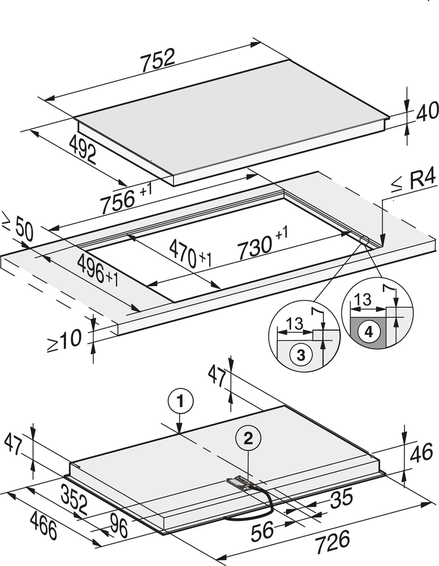 Сенсорное управление, с установкой заподлицо. шириной 752mm для установки заподлицо Универсально – 4 зоны, вкл. 1 зону расшир. и 1 зону расшир.