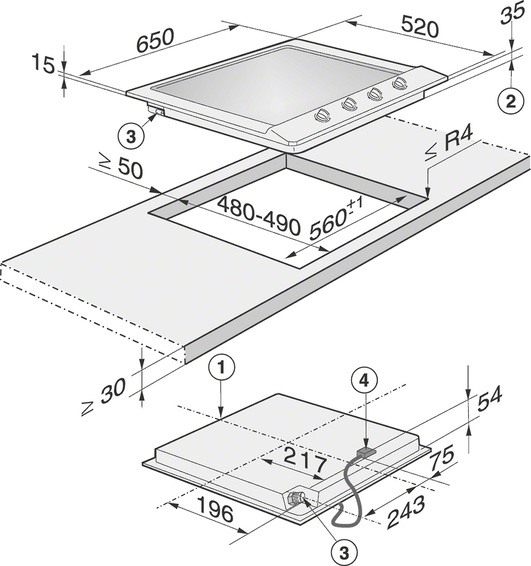 Простое управление одной рукой – поворотные переключатели Профессиональный дизайн – шириной 650mm мм с желобком из нерж. стали Универсально – 4 конфорки