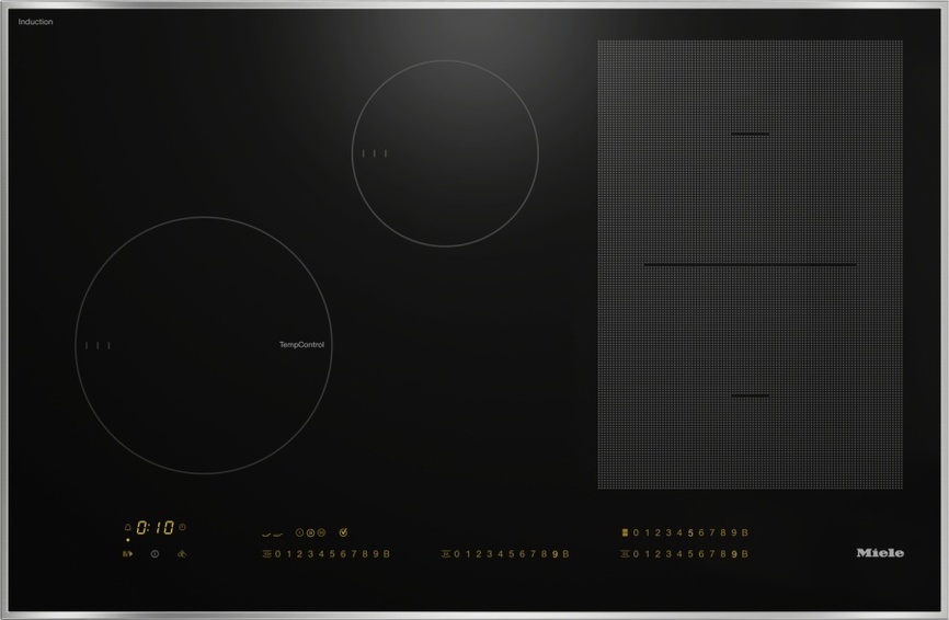 Узкая рамка из нержавеющей стали 4 индукционные конфорки с автоматикой закипания, в т. ч. 2 с возможностью объединения в 1 зону PowerFlex Сенсорная панель управления SmartSelect с отдельными клавишами 0–9 для каждой конфорки Ступени мощности 1–9 Функция TempControl (3 уровня нагрева) Функция Stop&Go Booster TwinBooster Функция поддержания тепла
