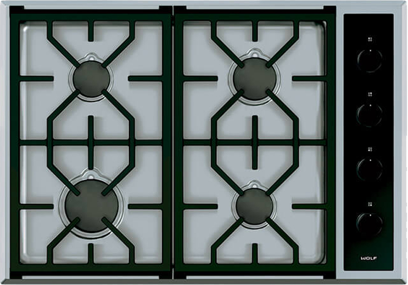 На варочной панели Transitional шириной 762 мм расположены 4 двухуровневые герметичные конфорки с запатентованным двухъярусным дизайном. Они обеспечивают особо скрупулезное управление процессом: от ультраделикатного пламени, идеального для плавления, приготовления соусов и супов, до жгучего, как в печи, пламени с увеличенной газовой мощностью в 5,3 кВт, благодаря чему закипание происходит на 25% быстрее, чем в предыдущих моделях. Прочные чугунные решетки с фарфоровым покрытием легко моются. Уникальный дизайн решёток позволяет перемещать посуду от конфорки к конфорке, не поднимая ее. На стильной черной панели управления расположены 4 регулятора из черного стекла, обрамленные стальными обручами. Подсветка появляется вокруг ручек управления только в случае их использования.