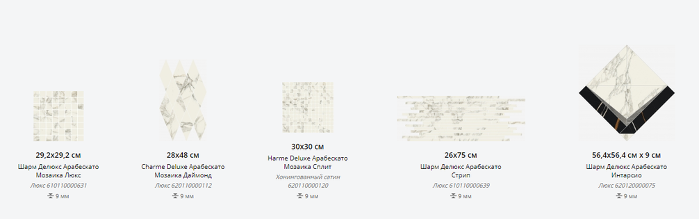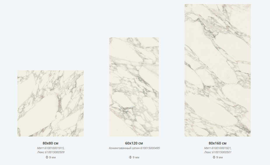 Представлена в размерах: 80х80 см, 60х120 см, 80х160 см, 120х278 см. Доступна с натуральной и патинированной поверхностью. Декор для плитки: 29.2x29.2 см, 28x48 см, 30x30 см, 26x75 cм, 56.4x56.4 смx9 cм. Применение - пол и стены.