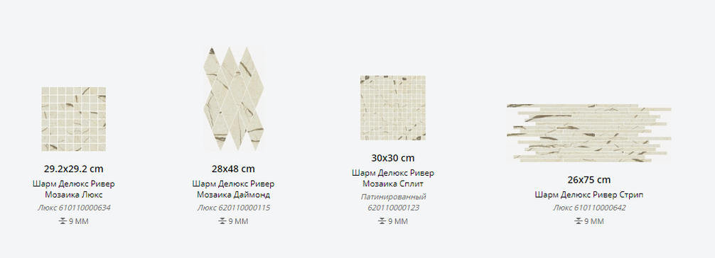 Представлена в размерах: 80х80 см, 60х120 см, 80х160 см. Доступна с натуральной и патинированной поверхностью. Декор для плитки: 29.2x29.2 см, 28x48 см, 30x30 см, 26x75 cм. Применение - пол и стены.