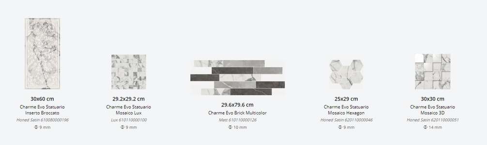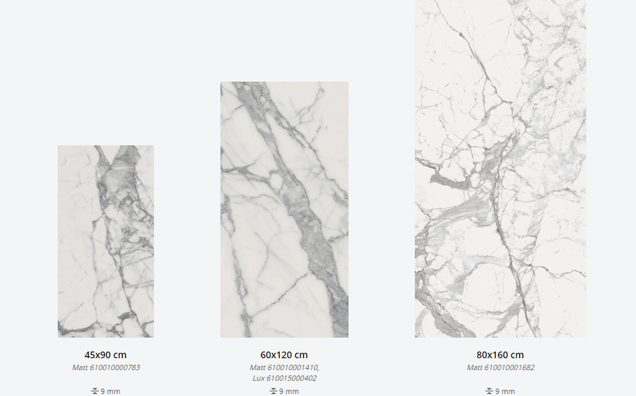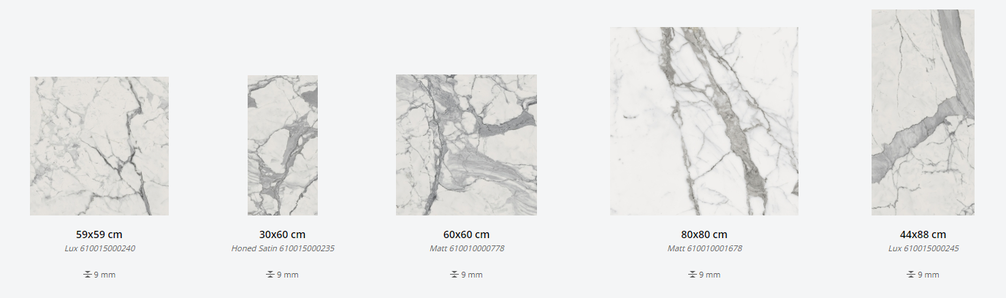 Представлена в размерах: 59х59 см, 30х60 см, 60х60 см, 80х80 см, 44х88 см, 45х90 см, 60х120, 80х160 см, 120х278 см. Доступна с натуральной, патинированной поверхностями и поверхностью люкс. Декор для плитки: 29,2х29,2 см, 29,6х79,6 см, 25х29 см, 30х30 см, 30х60 см. Применение - пол и стены.