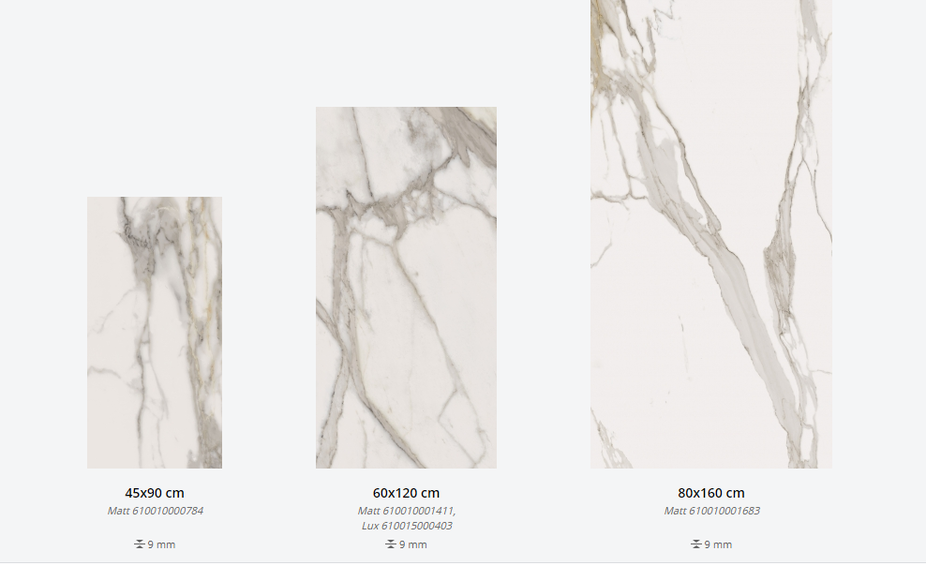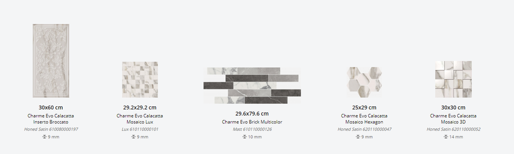 Представлена в размерах: 59х59 см, 30х60 см, 60х60 см, 80х80 см, 44х88 см, 45х90 см, 60х120, 80х160 см, 120х278 см. Доступна с натуральной, патинированной поверхностями и поверхностью люкс. Декор для плитки: 29,2х29,2 см, 29,6х79,6 см, 25х29 см, 30х30 см, 30х60 см. Применение - пол и стены.