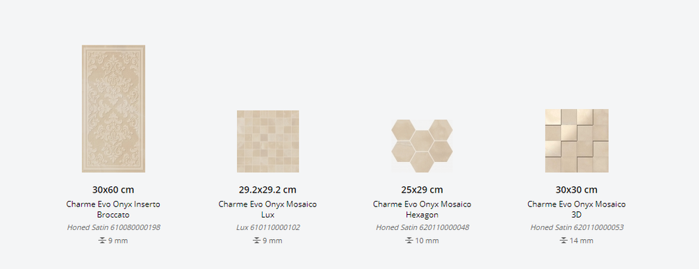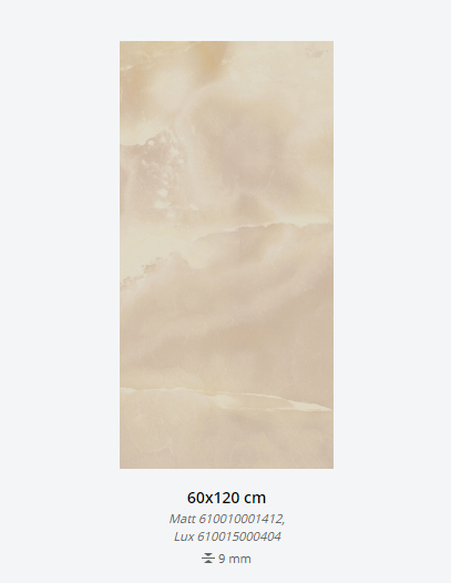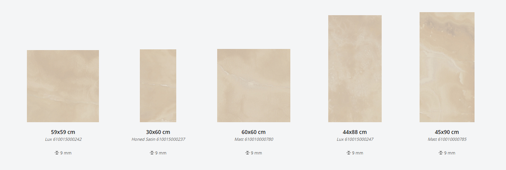 Представлена в размерах: 59х59 см, 30х60 см, 60х60 см, 44х88 см, 45х90 см. Доступна с натуральной, патинированной поверхностями и поверхностью люкс. Декор для плитки: 29,2х29,2 см, 25х29 см, 30х30 см, 30х60 см. Применение - пол и стены.