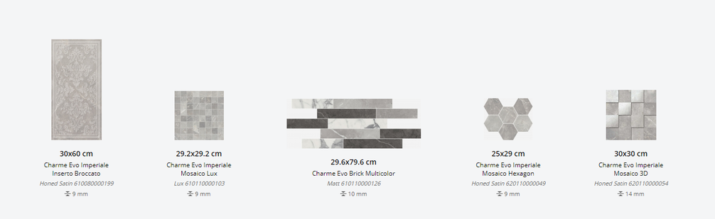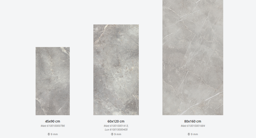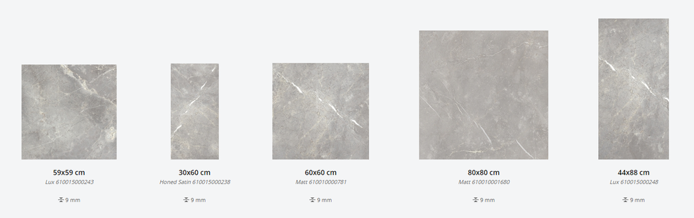 Представлена в размерах: 59х59 см, 30х60 см, 60х60 см, 80х80 см, 44х88 см, 45х90 см, 60х120, 80х160 см, 120х278 см. Доступна с натуральной, патинированной поверхностями и поверхностью люкс. Декор для плитки: 29,2х29,2 см, 29,6х79,6 см, 25х29 см, 30х30 см, 30х60 см. Применение - пол и стены.