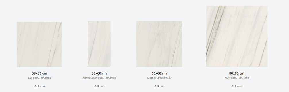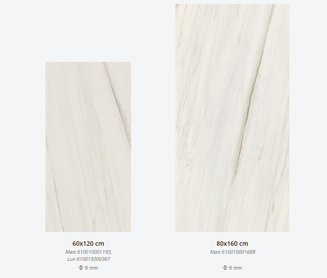 Представлена в размерах: 30х60 см, 59х59 см, 60х60 см, 80х80 см, 60х120 см, 80х160 см. Доступна с натуральной и патенированной поверхностями и поверхность люкс. Декор для плитки: 30х30 см, 29,2х29,2 см, 25х29 см, 28х48 см, 28,5х21 см, 59х59 см. Применение - пол и стены.