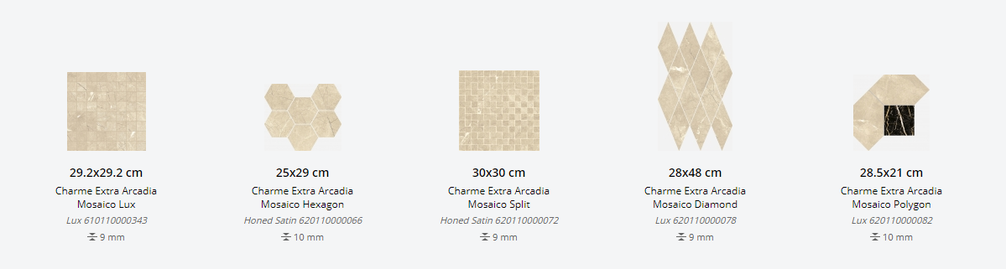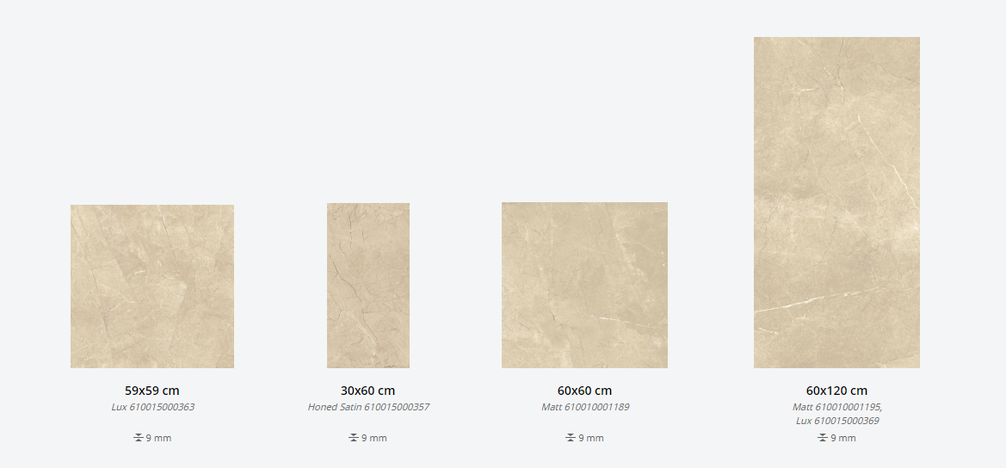 Представлена в размерах: 30х60 см, 59х59 см, 60х60 см, 60х120 см. Доступна с натуральной и патенированной поверхностями и поверхность люкс. Декор для плитки: 30х30 см, 29,2х29,2 см, 25х29 см, 28х48 см, 28,5х21 см, 59х59 см. Применение - пол и стены.