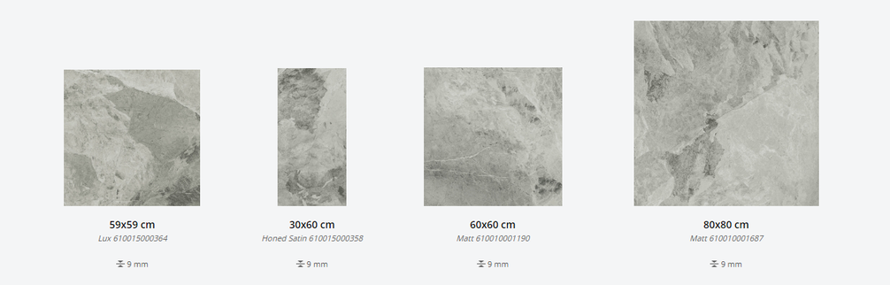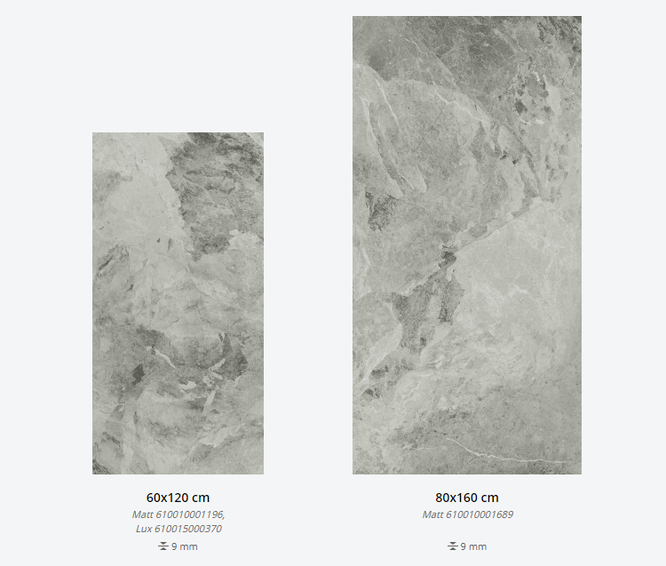 Представлена в размерах: 30х60 см, 59х59 см, 60х60 см, 80х80 см, 60х120 см, 80х160 см. Доступна с натуральной и патенированной поверхностями и поверхность люкс. Декор для плитки: 30х30 см, 29,2х29,2 см, 25х29 см, 28х48 см, 28,5х21 см, 59х59 см. Применение - пол и стены.