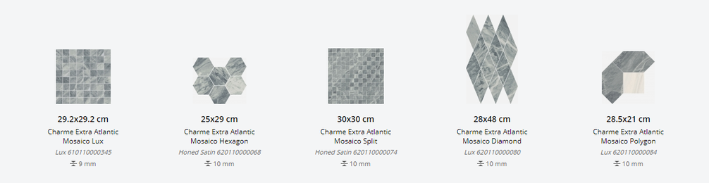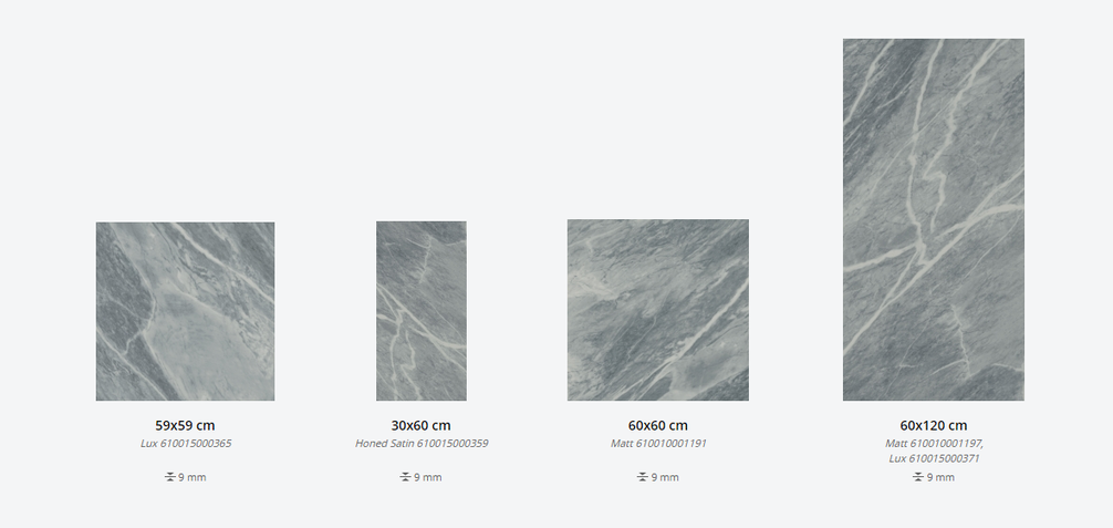 Представлена в размерах: 30х60 см, 59х59 см, 60х60 см, 60х120 см. Доступна с натуральной и патенированной поверхностями и поверхность люкс. Декор для плитки: 30х30 см, 29,2х29,2 см, 25х29 см, 28х48 см, 28,5х21 см, 59х59 см. Применение - пол и стены.
