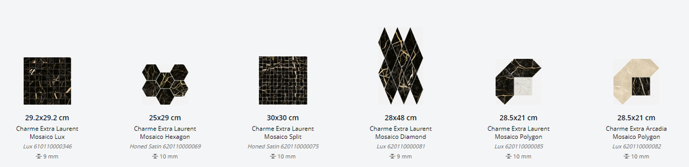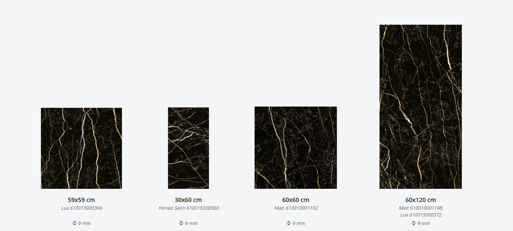 Представлена в размерах: 30х60 см, 59х59 см, 60х60 см, 60х120 см. Доступна с натуральной и патенированной поверхностями и поверхность люкс. Декор для плитки: 30х30 см, 29,2х29,2 см, 25х29 см, 28х48 см, 28,5х21 см, 59х59 см. Применение - пол и стены.