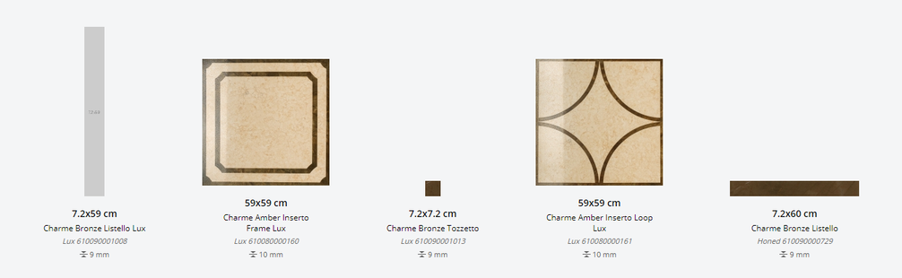 Представлена в размерах: 59х59 см, 60х60 см. Доступна с натуральной и шлифованной поверхностями и поверхностью люкс. Декор для плитки: 7,2х7,2см, 7,2х59 см, 7,2х60 см, 59х59 см. Применение - пол и стены.