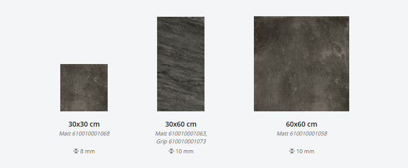 Представлена в размерах: 30х30 см, 30х60 см, 60х60 см. Доступна с натуральной и структурированной поверхностями. Декор для плитки: 30х30 см, 30х60 см, 26х75 см, 28х78 см. Применение - пол и стены.