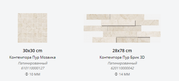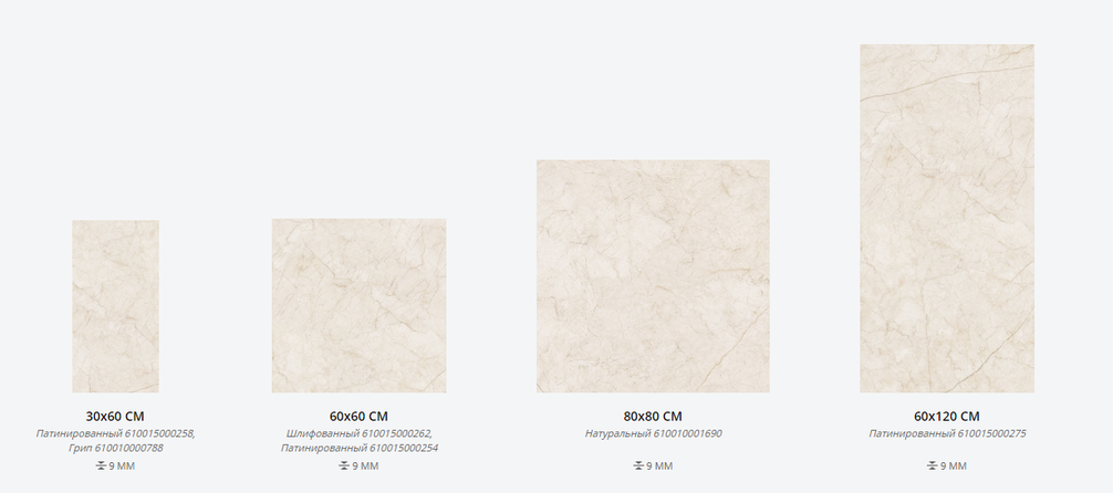 Представлена в размерах: 30х60 см, 60х60 см, 60Х120 см, 80х80 см, 80х160 см. Доступна с патинированной, шлифованной и структурированной поверхностями. Декор для плитки: 30х30 см, 28х78 см. Применение - пол и стены.