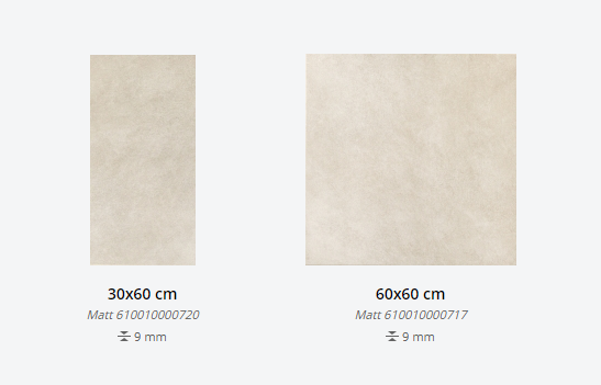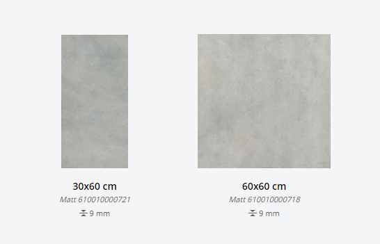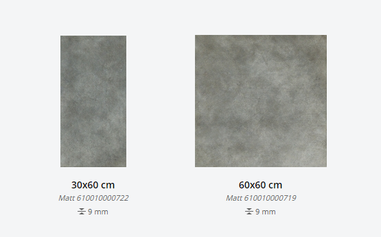Представлена в размерах: 30х60 см, 60х60 см. Доступна с натуральной поверхностью. Цветовая палитра и артикулы: Grey, Fume, White. Применение - пол и стены.