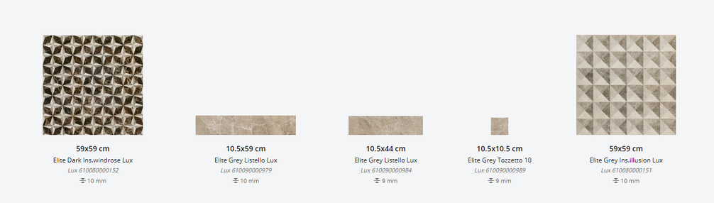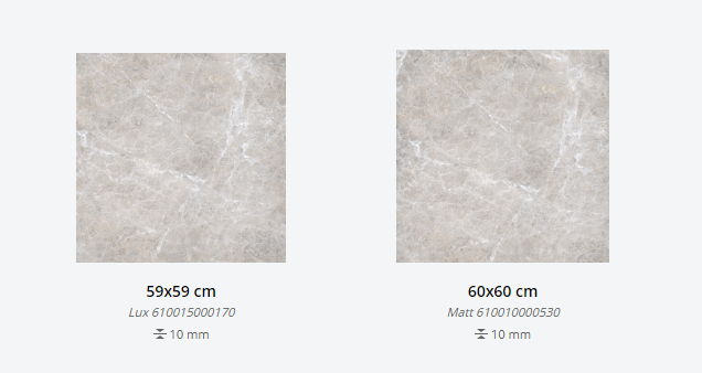 Представлена в размерах: 59х59 см, 60х60 см. Доступна с натуральной поверхностью и поверхностью люкс. Декор для плитки: 10,5х 44см, 10,5х10,5 см, 59х59 см, 10,5х59 см. Применение - пол и стены.