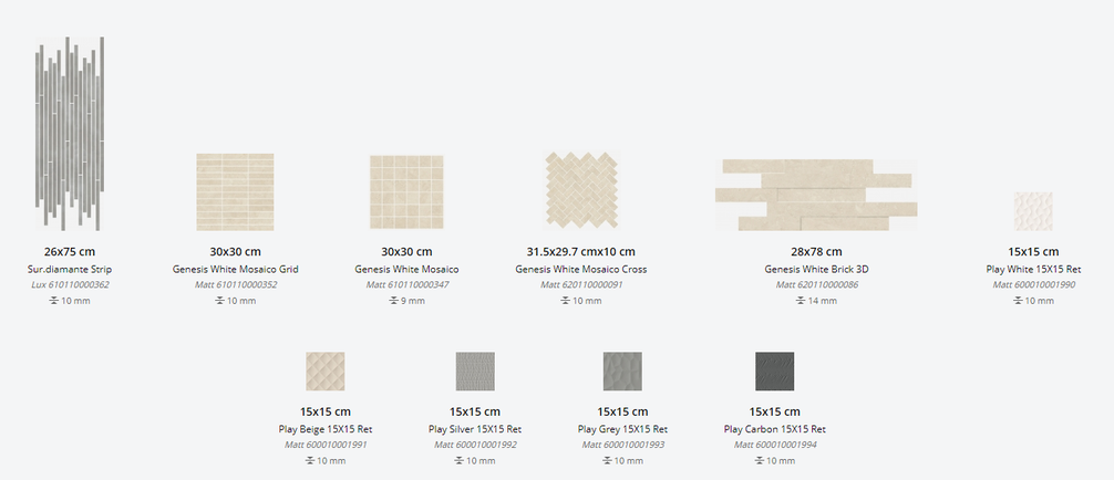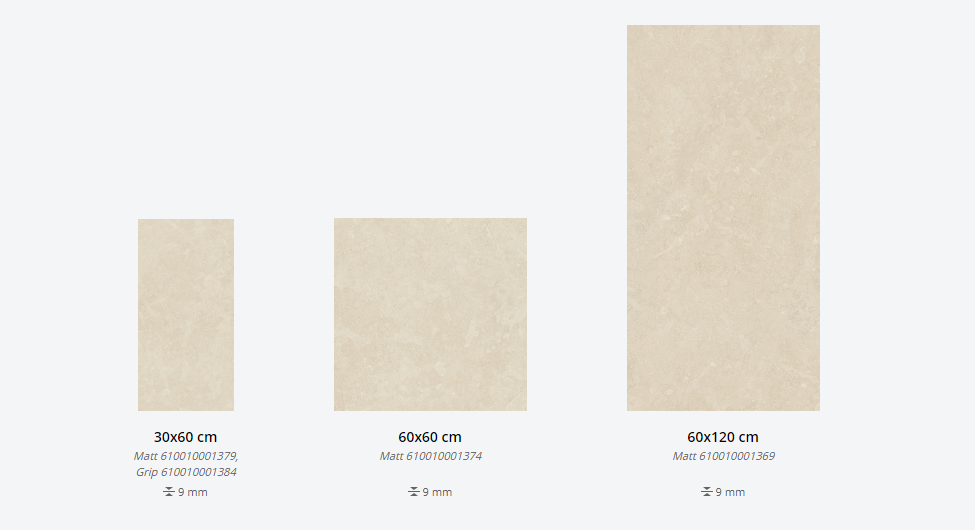 Представлена в размерах: 30х60 см, 60х60 см, 60х120 см. Доступна с натуральной и структурированной поверхностями. Декор для плитки: 30х30 см, 31,5х29,7 см, 28х78 см, 15х15 см, 26х75 см. Применение - пол и стены.