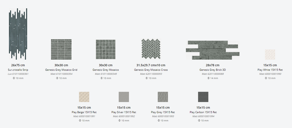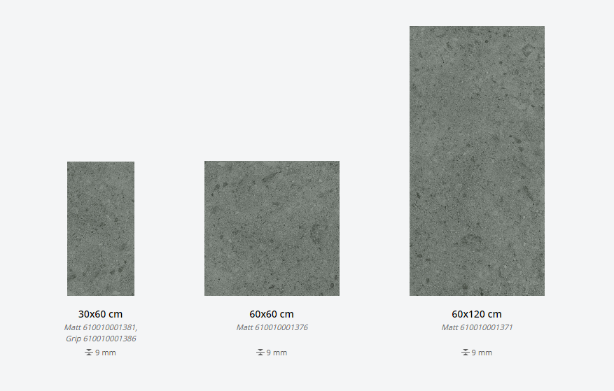 Представлена в размерах: 30х60 см, 60х60 см, 60х120 см. Доступна с натуральной и структурированной поверхностями. Декор для плитки: 30х30 см, 31,5х29,7 см, 28х78 см, 26х75 см, 15х15 см. Применение - пол и стены.