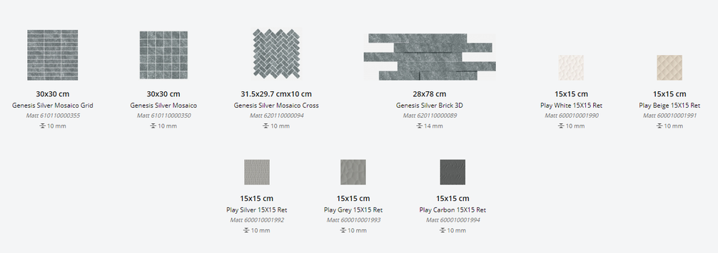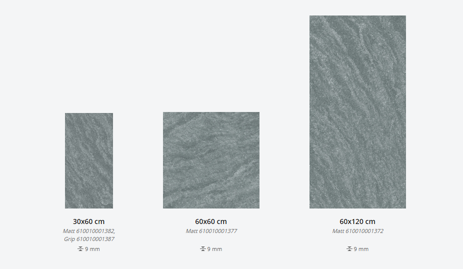 Представлена в размерах: 30х60 см, 60х60 см, 60х120 см. Доступна с натуральной и структурированной поверхностями. Декор для плитки: 30х30 см, 31,5х29,7 см, 28х78 см, 15х15 см. Применение - пол и стены.