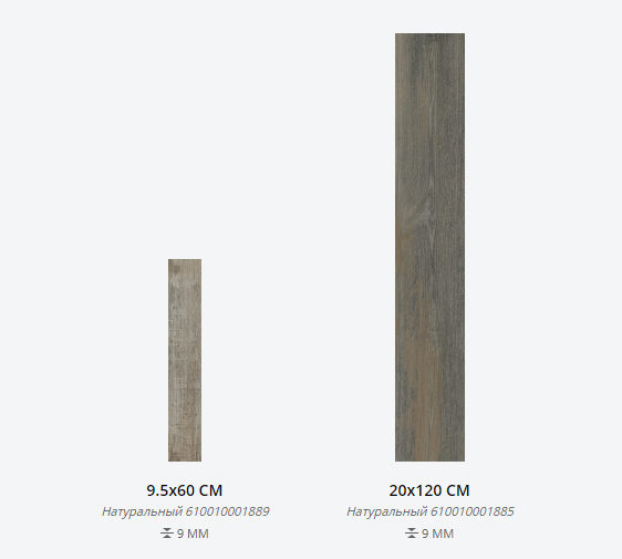 Представлена в размерах: 20х120 см, 9,5х60 см. Доступна с натуральной поверхностью. Применение - пол и стены.