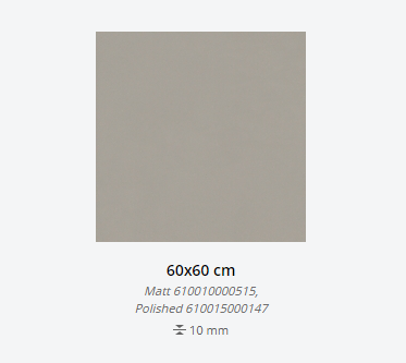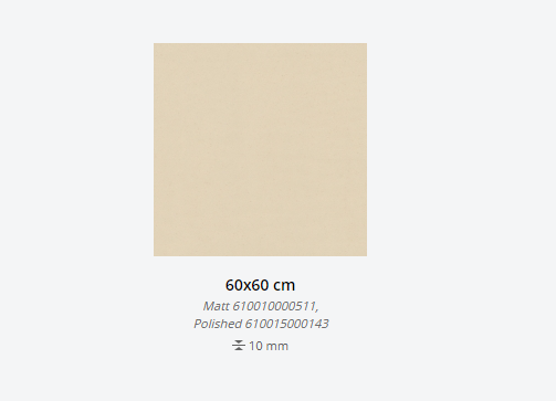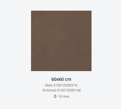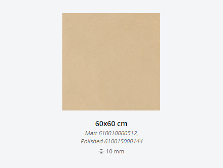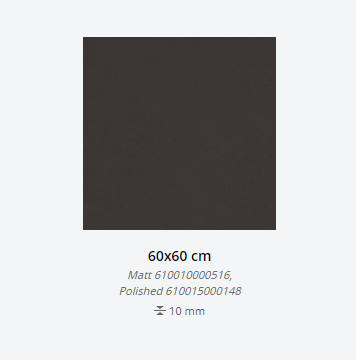 Представлена в размерах: 60х60 см. Доступна с натуральной и полированной поверхностями. Цветовая палитра и артикулы: White, Beige, Brown, Grey, Black. Применение - пол и стены.