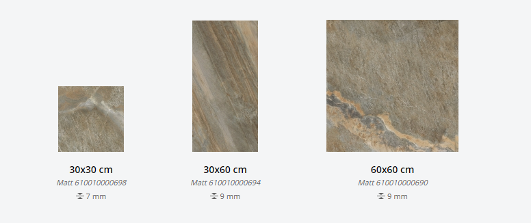 Представлена в размерах: 30х30 см, 30х60 см, 60х60 см. Доступна с натуральной поверхностью. Декор для плитки: 30х30 см. Применение - пол и стены.