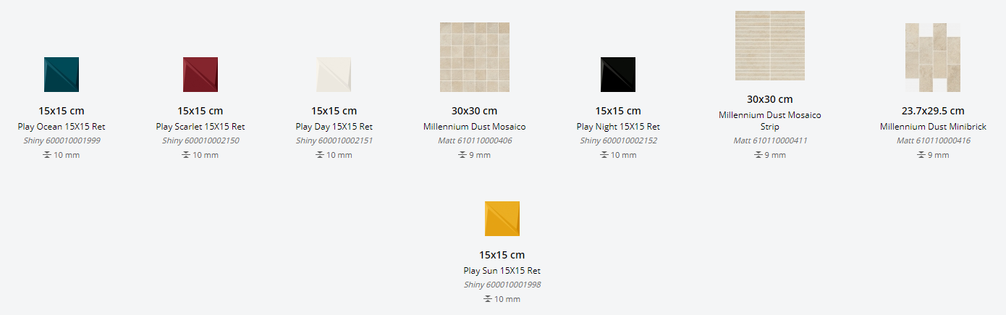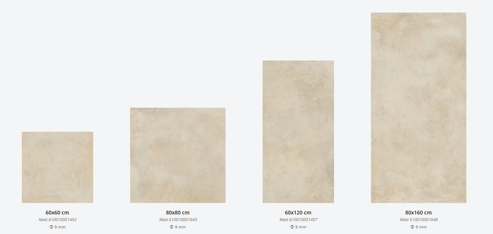 Представлена в размерах: 60х60 см, 80х80 см, 60х120 см, 80х160 см. Доступна с натуральной поверхностью. Декор для плитки: 15х15 см, 30x30 см, 23,7x29,5 см в разных цветовых сочетаниях. Применение - пол и стены.