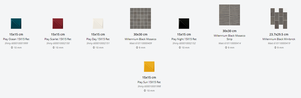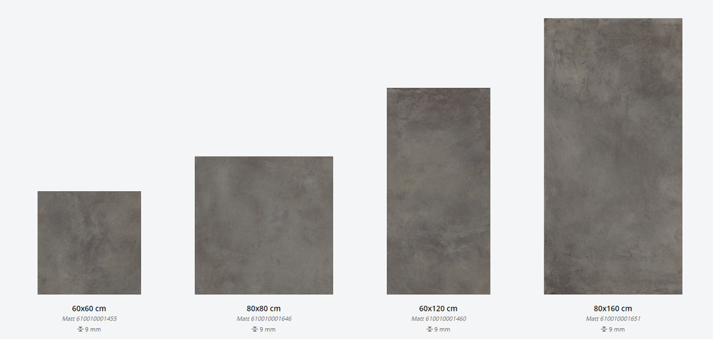 Представлена в размерах: 60х60 см, 80х80 см, 60х120 см, 80х160 см, 120х278 см. Доступна с натуральной поверхностью. Декор для плитки: 15х15 см, 30x30 см, 23,7x29,5 см в разных цветовых сочетаниях. Применение - пол и стены.