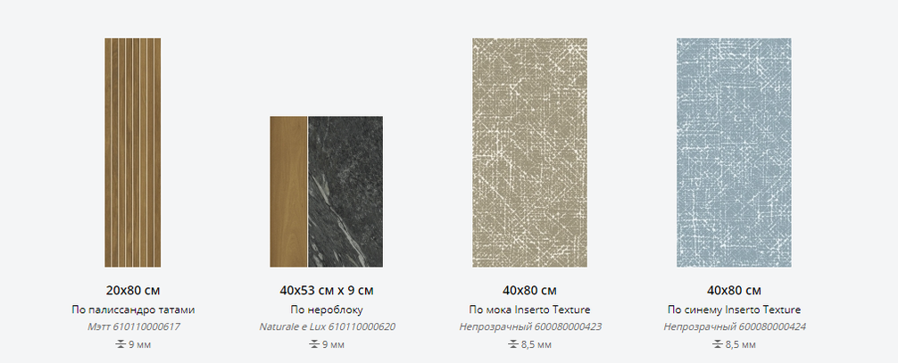 Представлена в размерах: 20X60 см. Доступна с натуральной и патинированной поверхностью. Декор для плитки: 20Х80 см, 40x53 см, 40x80 см. Применение - пол и стены.