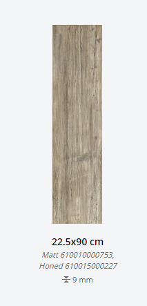 Представлена в размерах: 22,5х90 см. Доступна с натуральной и шлифованной поверхностями. Применение - пол и стены.