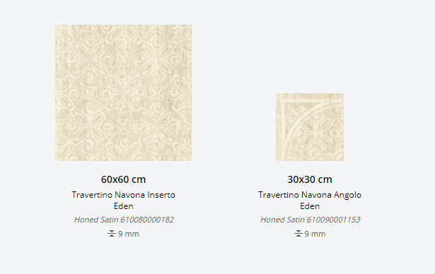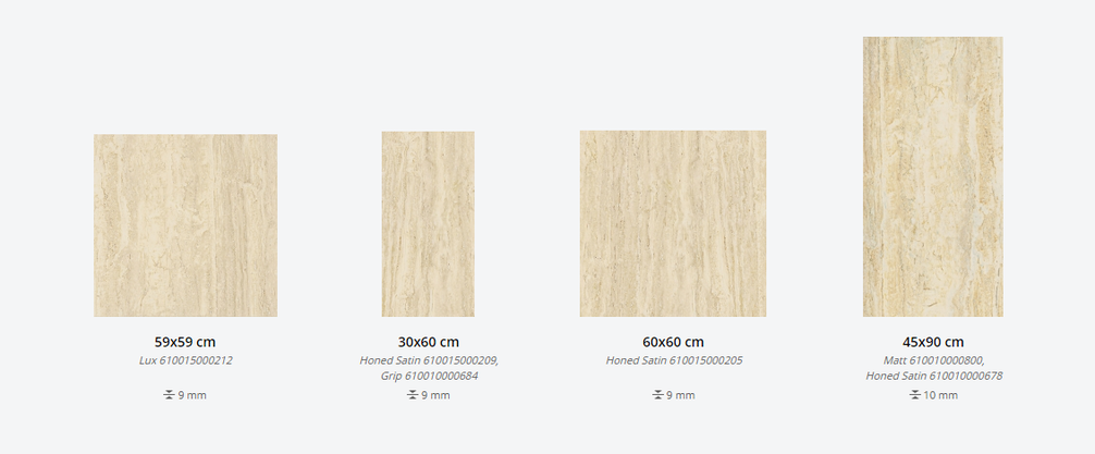 Представлена в размерах: 30х60 см, 59х59 см, 60х60 см, 45х90 см. Доступна с натуральной, патинированной, шлифованной и структурированной поверхностями и поверхностью люкс. Декор для плитки: 30х30 см, 30х60 см, 29,2х29,2 см, 59х59 см, 60х60 см. Применение - пол и стены.