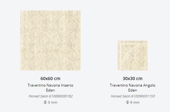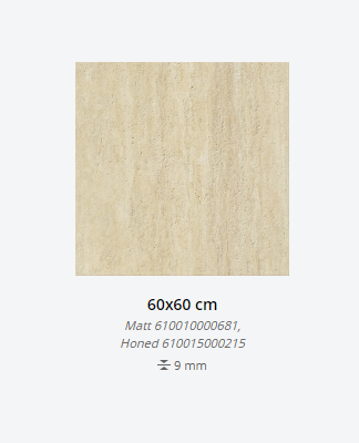 Представлена в размерах: 60х60 см. Доступна с натуральной, патинированной, шлифованной и структурированной поверхностями и поверхностью люкс. Декор для плитки: 30х30 см, 30х60 см, 29,2х29,2 см, 59х59 см, 60х60 см. Применение - пол и стены.