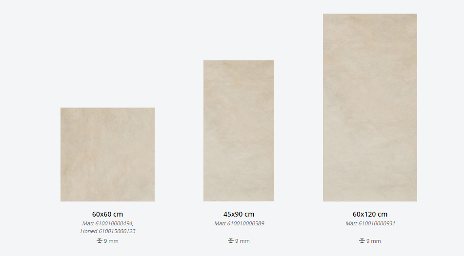 Представлена в размерах: 60х60 см, 45х90 см, 60х120 см. Доступна с натуральной и шлифованной поверхностями. Декор для плитки: 30х60 см. Применение - пол и стены.