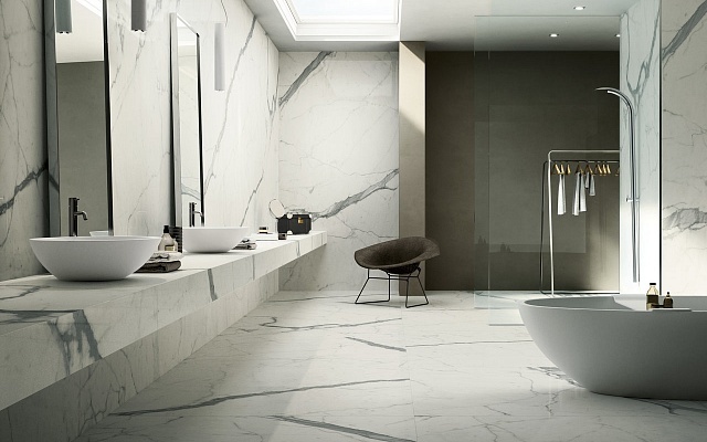Доступна с патинированной и полированной поверхностью - CALACATTA SGF.MM.CS.LUC. Представлена в размере: 3000 х 1500 х 6 мм. Может применяться в качестве напольной плитки.