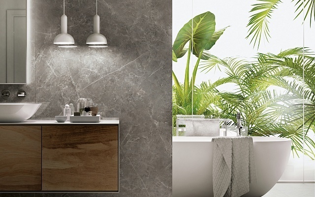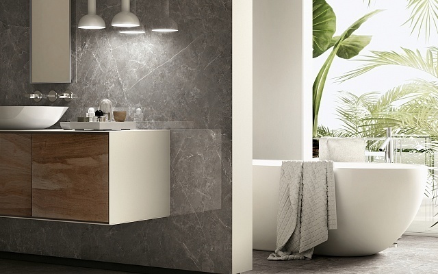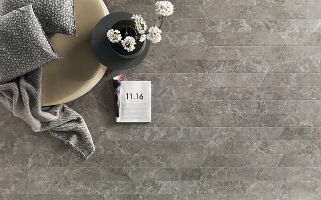 Водопоглощение - 0,1, стойкий на изгиб, устойчивый к глубокому истиранию, твердость по шкале Мооса - класс 5, стойкий к тепловым перепадам и образованию пятен, сопротивление к скольжению, огнестойкость класса А 2-S1. Доступна с матовой и полированной поверхностью - MARBLE GREY SP.TR.SG.LX. Представлена в размере: 3000 х 1000 х 5,5 мм. Может применяться в качестве напольной плитки.