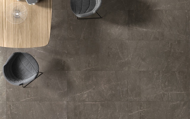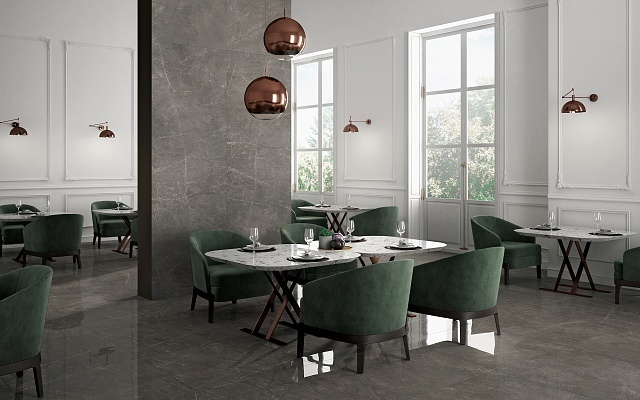 Водопоглощение - 0,1, стойкий на изгиб, устойчивый к глубокому истиранию, твердость по шкале Мооса - класс 5, стойкий к тепловым перепадам и образованию пятен, сопротивление к скольжению, огнестойкость класса А 2-S1. Доступна с матовой и полированной поверхностью - MARBLE GREY SP.TR.SS.LX. Может применяться в качестве напольной плитки.