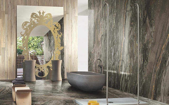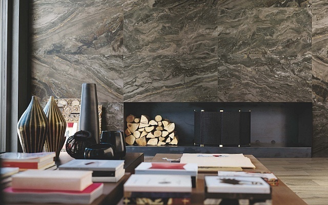 Доступна с матовой и полированной поверхностью - MARBLE GREY SF.PRX.DA.GL. Представлена в размерах: 2400 х 1200 х 6 мм, 2800 х 1200 х 6 мм и 3200 х 1600 х 6 мм. Может применяться в качестве напольной плитки.