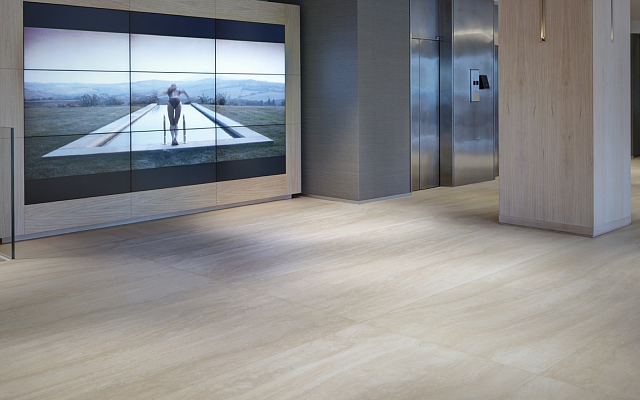 Водопоглощение - 0,1, стойкий на изгиб, устойчивый к глубокому истиранию, твердость по шкале Мооса - класс 5-7, стойкий к тепловым перепадам и образованию пятен, сопротивление к скольжению, огнестойкость класса А 2-S1. Доступна со структурированной поверхностью. Представлена в размере: 3000 х 1000 х 5,6 мм. Может применяться в качестве напольной плитки.
