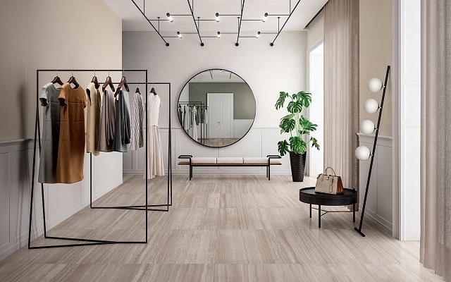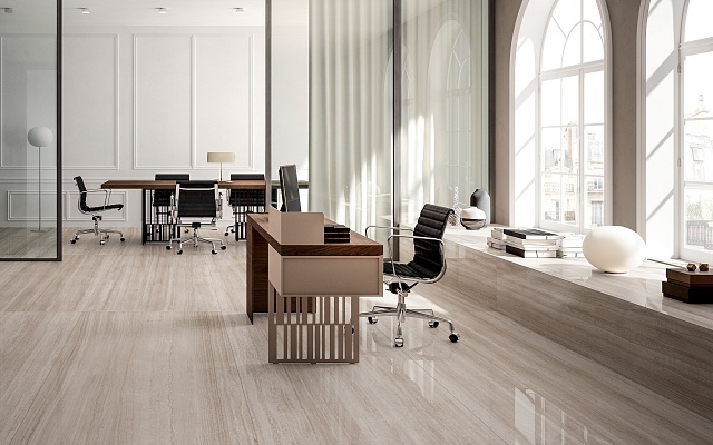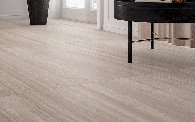 Доступна с матовой и полированной поверхностью - TRAVERTINO SC.EX.RS.GL. Представлена в размерах: 3000 х 1000 х 5,5 мм, 880 х 880 х 14 мм. Может применяться в качестве напольной плитки.