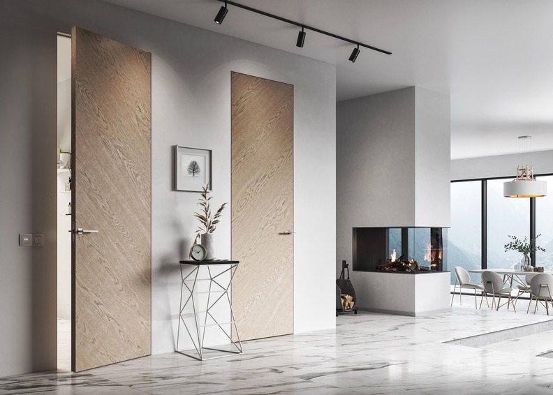 Высота дверей может достигать 250 см. Варианты коробов: компланарный короб с единой плоскостью полотна и наличника, стандартный короб, скрытый алюминиевый короб - скрытые петли и бесшумный магнитный замок. Стандартно доступен окрас двери в 9 оттенков шпона из натурального дуба. Шпонированные двери LEVEL также могут быть выполнены в скрытом алюминиевом коробе.