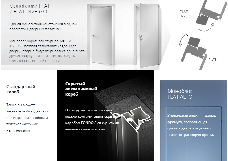 Высота дверей может достигать 250 см. Варианты коробов: моноблоки FLAT и FLAT INVERSO, моноблок FLAT ALTO, стандартный короб, скрытый алюминиевый короб - скрытые петли и бесшумный магнитный замок. Двери OPERA могут быть окрашены в любой цвет по каталогу RAL на Ваш выбор.