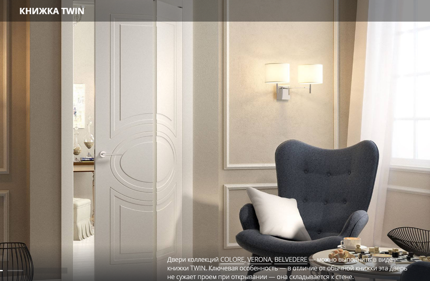 Двери коллекций COLORE, VERONA, BELVEDERE — можно выполнить в виде книжки TWIN. Ключевая особенность — в отличие от обычной книжки эта дверь не сужает проем при открывании — она складывается к стене.