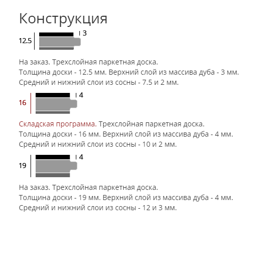 Сортировка CHARACTER. Складская программа. Древесина смешанного распила. Обладает природным рисунком и выраженной текстурой древесины. Допускаются живые не выпавшие сучья до 50 мм, выпавшие сучья до 40 мм и трещины, заделанные шпатлевкой. На лицевой стороне допускаются перепады тонов, сердцевинные лучи, прожилки, заболонь. SUPER-SELECT. На заказ. Обладает натуральным рисунком древесины, возможны незначительные перепады по тону и цвету. Предполагает однородную текстуру без резких перепадов и различий по цвету. Допускаются здоровые не выпавшие сучья до 5 мм. Заболонь и трещины не допускаются. На заказ возможно изготовление паркетной доски монодлины (все доски в пачке максимального размера)." Паркетная доска ROAD AND GUN возможна как в стандартном исполнении так и на заказ. Доска имеет три размера по толщине: 12,5 мм, 16 мм, 19 мм и три размера по ширине: 110 мм, 190 мм и 300 мм.